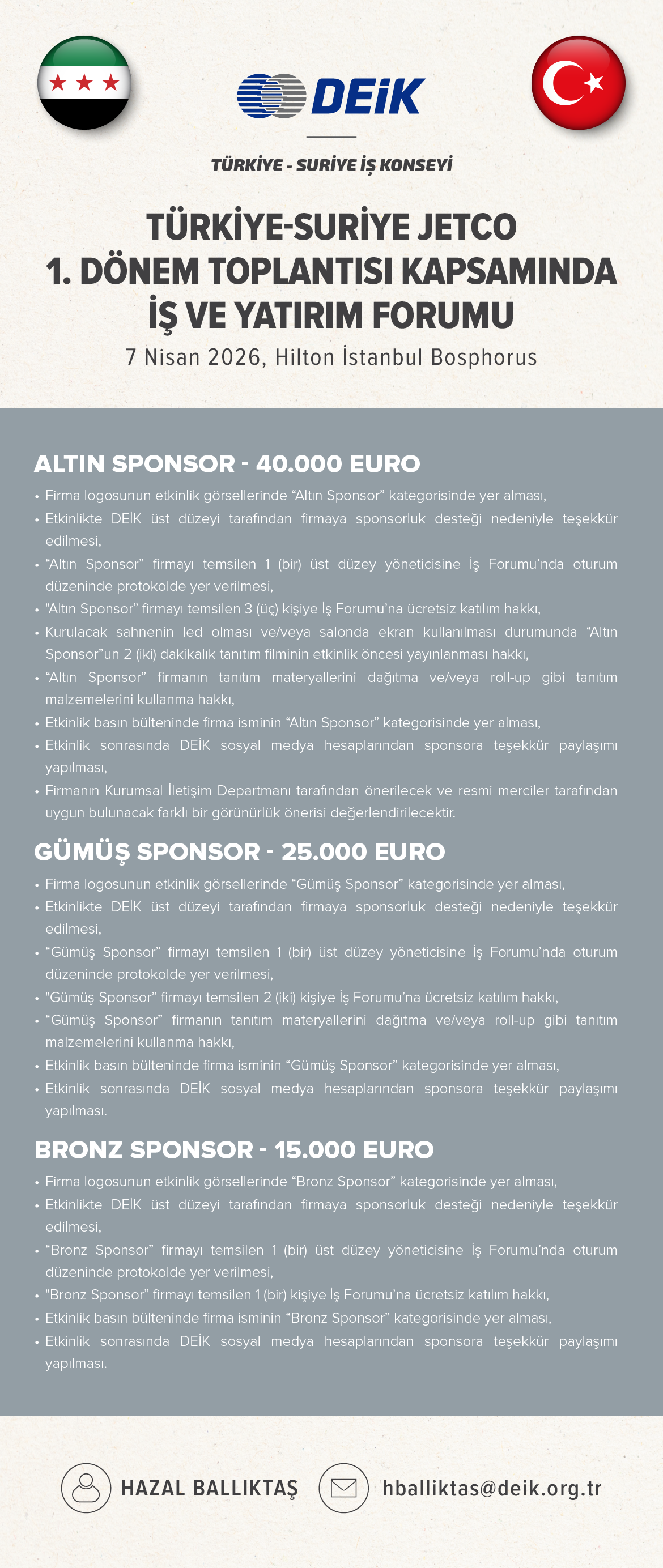 İletilen yazıda, T.C. Ticaret Bakanı Prof. Dr. Ömer Bolat ve Suriye Arap Cumhuriyeti Ekonomi ve Sanayi Bakanı Prof. Dr. Muhammed Nidal eş-Şaar eş başkanlıklarında gerçekleştirilecek Türkiye-Suriye JETCO I. Dönem Toplantısı vesilesiyle, 7 Nisan 2026 tarihinde ikili iş görüşmeleri eşliğinde ve iş dünyası temsilcilerinin katılımlarıyla 11.15 - 16.00 saatleri arasında Hilton İstanbul Bosphorus’ta Türkiye-Suriye İş ve Yatırım Forumu düzenleneceği bildirilmiştir.