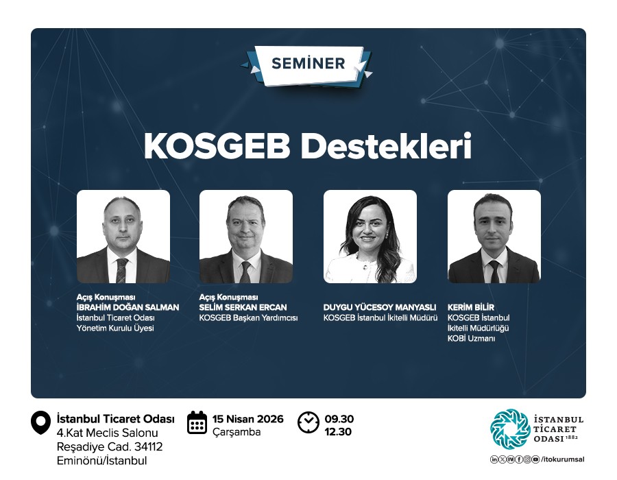 Yapılan bilgilendirmede KOSGEB Destekleri Bilgilendirme Semineri'nin 15 Nisan 2026 Çarşamba günü saat 09.30 - 12.30 saatleri arasında İTO Eminönü Merkez Bina 4. Kat Meclis Salonu'nda gerçekleştirileceği ve tüm üyelerimizin katılımına açık olduğu bildirilmiştir.